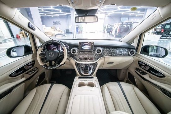 奔驰V250商务车内饰方面同样做了整体的升级,中控台、方向盘、门板、车侧壁、车顶、进门的踏步整体升级包覆。正副驾驶座椅升级包覆、销售经理:187 2222 7779 苏经理(电话同微信)正副驾驶座椅中间加装车载扶手冰箱、正副驾驶座椅头顶定制宽屏车载网络电视、正副驾驶座椅椅背后方加装可伸缩的小桌板。第二排座椅升级成两个独立的航空座椅,航空座椅带多向电动调节功能,带通风、加热、按摩等舒适功能、同时航空座椅还带有选装功能,旋转之后可与第三排座椅形成对坐状态。第三排座椅升级成宽大舒适的三联排沙发床,可电动调节、前后移动,靠背可180度放平平卧。