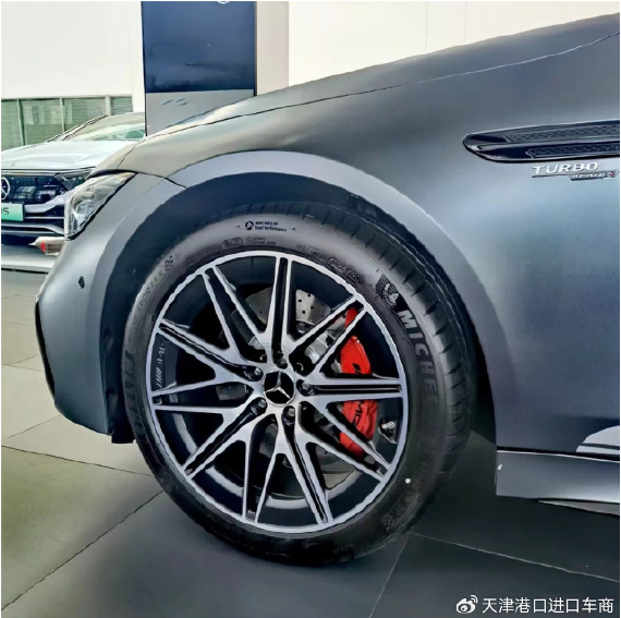AMG-GT50四门,车长超过5米,轴距接3米,是名副其实的大型四门GT跑车,四驱版本,前后20英寸轮圈,比后驱版本大一号,R20寸倍耐力轮胎,内置红色的刹车卡钳,非常性感,尾部则是宽大的“屁股”,带可升降尾翼,下方为双边四出的圆孔排气管。