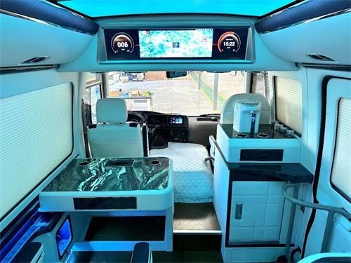 在功能方面本车配置有32寸智能液晶电视以及5.1声道美国莱福音响,不论是用来播放考察资料还是相关ppt都能够实现。除此之外,本车还搭配有音箱系统,公司团建的时候就是一间移动的K歌房,能够快速炒热气氛,急速拉员工之间的距离。
