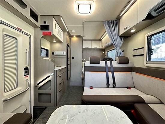 会客区采用L型布局方式,基于人体工程学设计,外侧配有扶手;中间为固定餐桌;沙发内侧墙壁上有窗户,推窗上方有储物柜,方便日常使用。并且在休息时可对其放平成床进一步增加我们的休息空间。