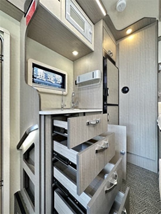 厨房区位于车厢中部。配备志高电磁炉及不锈钢洗手池等;上方和下方均设计有多组储物柜,储物空间丰富;周围一组220V电源插座可为手机等小型电器充电。配有12L饮用水装置,直饮安全卫生又便捷。橱柜右侧设置调料架,下方有储物空间。标配900W电磁炉、微波炉,旅居途中随时享受美味。标配85L房车专用冰箱,可选152L超大容量房车专用冰箱,保障食材新鲜。