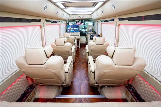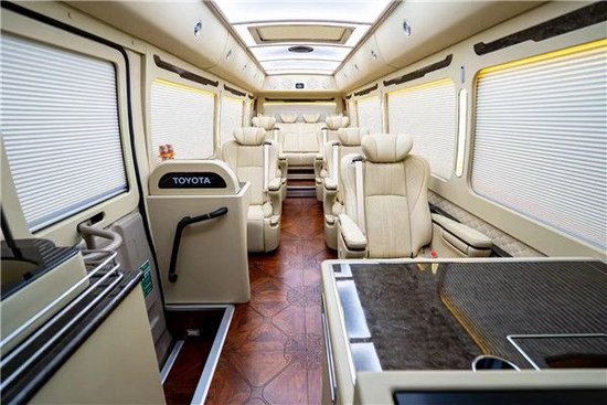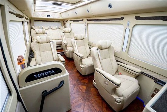丰田考斯特的内饰改装上可以说是奢华备至,全封闭间隔,5.1声道文娱影音导航系统,32寸车载专用液晶显示屏,空客A380顶棚,原装进口埃尔法 (配置|询价)座椅,首长席办公桌,报告席办公桌,秘书席办公桌等等,肯定的陆地领航商务招待的模范。考斯特窗帘可以选择豪华的布艺窗帘或舒适的百叶窗帘,百叶窗帘可以选择是手动的还是自动的,加装窗帘装饰框等,更加贴合顾客的需求;地毯可以选择通道地毯或全车加装木质地板,选择自己理想的风格。