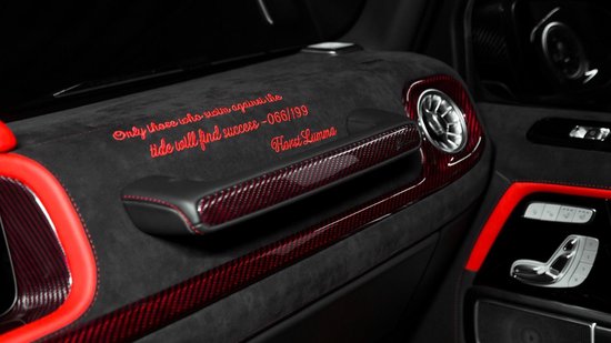 这款德国LUMMA G770R豪华越野车的主题色彩鲜明而整体,善于运用“点、线、面”的形式关系,对比色的大胆运用给人以超强的视觉冲击力,从铝制踏板组,到具有真皮革包边的脚垫和行李箱垫,LUMMA风格扶手箱,车内空调出风口周边的LUMMA碳纤维,格言刺绣,NAPPA真皮座椅,Alcantara全包覆星空顶棚,一直到完成皮革涂饰,赋予作品更强的现代感和时尚感。