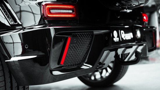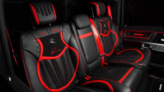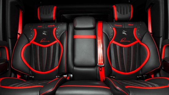 从内到外每一处细节都是纯碳纤打造,而在此之上的备用车轮罩、带附加制动灯的车顶扰流板和附加日间行车灯的车顶杆也由碳纤维制成。不仅用高档皮革加翻毛皮并点缀碳纤维,还运用了大胆的色彩搭配方案让人眼前一亮,完美地融入在奔驰原厂的内饰中,尽情演绎了“奢华”的定义。
