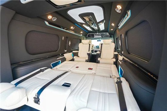 丰田海狮车内搭载42寸高清液晶电视,高级吧台配有液晶触控屏调节车内操作,吧台同时配有隐藏秘书座椅,让商务生活更充实。车顶设计浩瀚星空顶氛围灯,灯光多色可调。整车内饰车窗选用高级麂皮绒窗帘,柔软舒适。