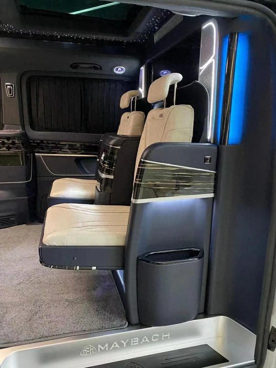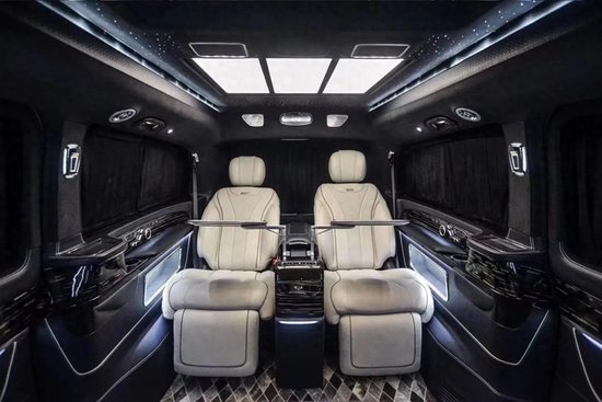 大家好,商务车解说,我是鲁秋君。目前国内商务车和保姆车市场,除了丰田系列的埃尔法 (配置|询价),与其并驾齐驱的就是奔驰系列了。这台奔驰商务车就是基于奔驰顶配加长版定制而成的。外观的格调是经典的迈巴赫款式,打开车门优势一番风味了。