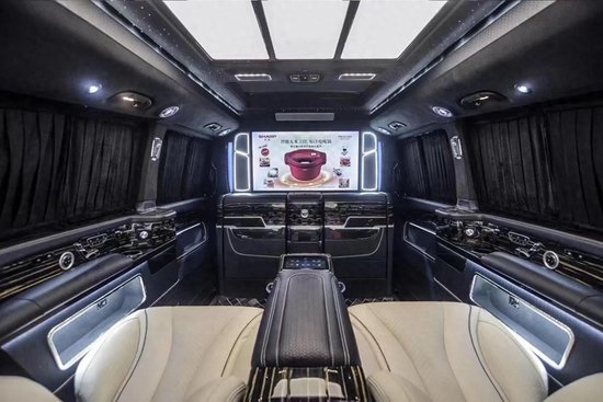 这台车的设计专为舒适性而打造,可以称得上是一款真正的老板座驾了,车内还配备了小桌板进行办公,保险箱可以储备重要的文件和资料,两个秘书座椅方便交谈,繁星点点的星空顶添加了整车范围。内饰经典的黑白配色,从里到外透露着的大气,高端。