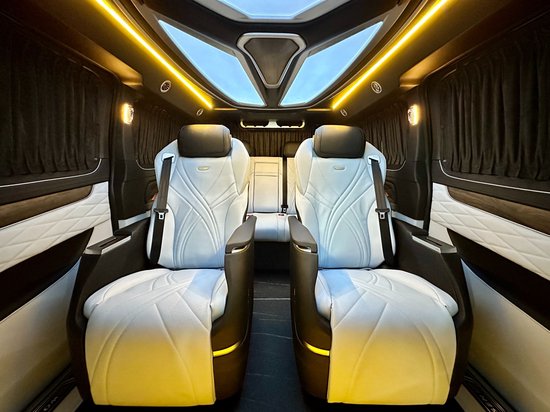 7座MPV商务车2+2+3的座椅布局。加热仓的两个座椅均带有通风和加热以及电子的调节中央还有扶手冰箱。全车都是拉帕头层小牛皮真皮包覆,再搭配上法式的双缝线,做工细致,工艺精湛。