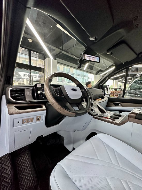地板采用高密度耐磨材料,具备隔音性好、保温性好等特点,还可以隔绝轮胎行驶过程中产生的近80%的胎噪,使车内达到最佳的舒适环境。为了增加整车氛围感,配有车身氛围灯条,搭配车顶独家开模的高达顶灯,三色可调可根据使用环境进行调节,顶部还配备了24寸的智能液晶显示屏,可以同步车辆的车速、时间。