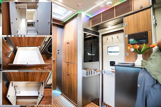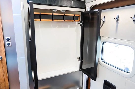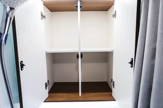 卫浴间外部的组合柜包含衣柜、储物抽屉及鞋柜,其中衣柜区内部进行了隔断处理,挂物、叠物、贴身衣物均有单独存放的区域。实际操作中,合页、门锁的质感给我们留下了较深印象,细节方面确实可以达到中高端房车水准。