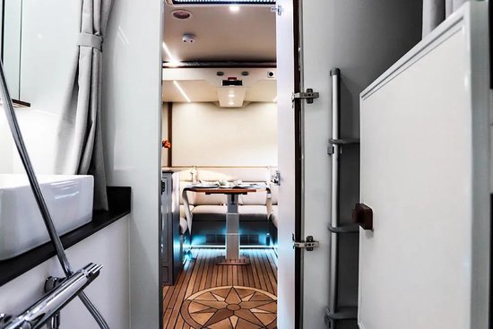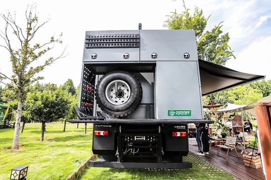 生活区内部并非常规的中卡房车布局,卫浴间设置在前部,通舱窗口直接连通卫浴间。内部布局因此变为前置卫浴间、中置厨房区、尾置会客区,新车核载人数为4人,厢体内部可乘坐2人。