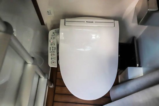 卫生间提供松下电动马桶,且在上方配备多组储物格,就配置而言已经非常靠进星级酒店水平。