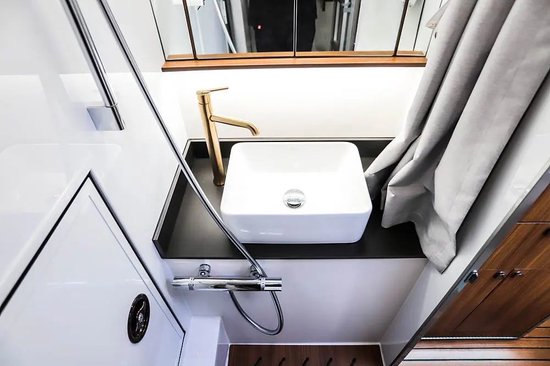 我们先来看前置卫浴间区域,整体横置布局包含左侧座便器、中间淋浴区及右侧洗手池,卫生间通过浴帘形成了干湿分离结构。卫浴间墙板均采用防水材质,并在底部铺设有木制地板。