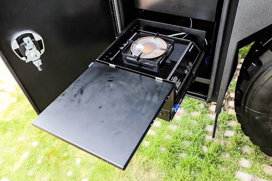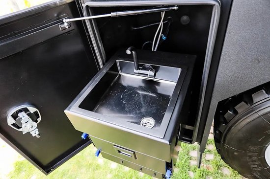 户外露营配置集中在车侧,包括炉灶/洗手池一体式抽拉灶台、风感电动遮阳棚、外侧照明灯、电动踏步、外放电源接口等。