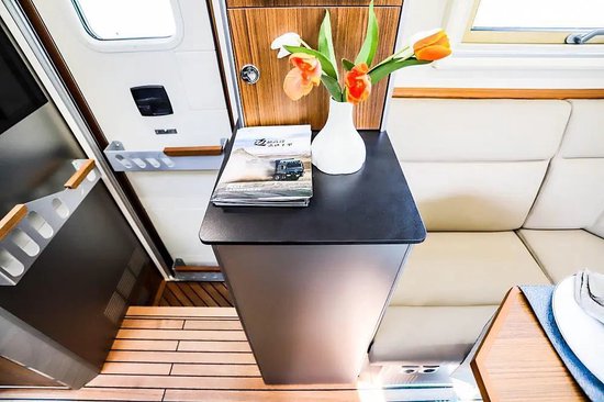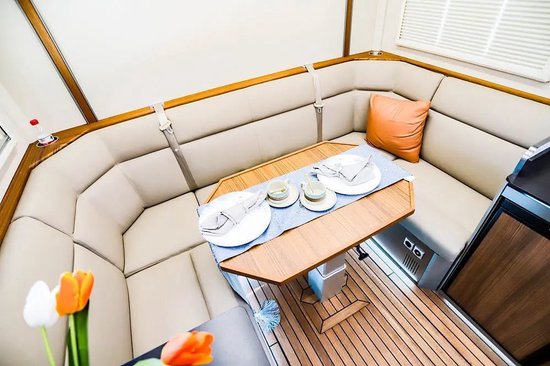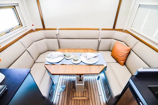在布局行驶上,依旧是常见的U型沙发,采用苯胺真皮材质,座垫柔软,回弹性高,乘坐舒适性不错,配合升降桌使用,该区域还能拼接一张完整的拼床,可供2名成年人休息。沙发底部匹配有电源插座,两侧提供侧窗可提供采光通风作用。靠进乘客座椅位置我们还可以看到杯架、安全带。