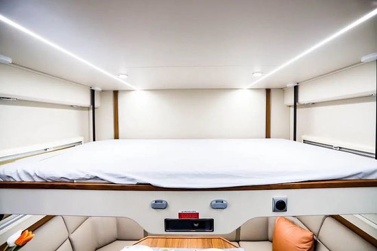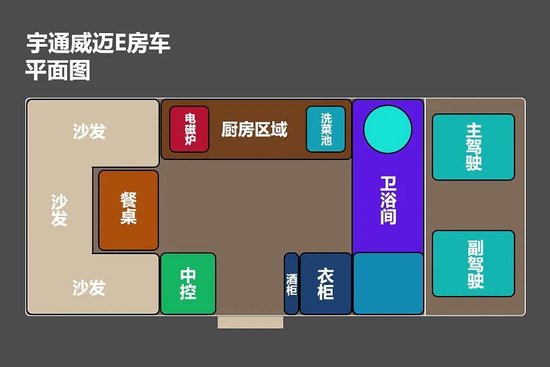 中控模块集成在宇通定制的10英寸触控屏中,涉及灯光控制、空调水暖、电器设施等,屏幕还可以显示水电信息。水电方面,宇通威迈E搭载260L净水箱、70L+55L灰水箱、50L黑水箱;24V 820Ah锂电+5kW逆变器将为车内提供用电支持,除此之外,2.8kW便携式发电机、1000W太阳能电池板还可以及时补充电能。