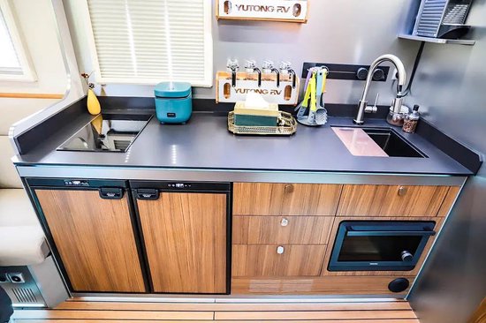 厨房区顶部配备了抽油烟机和顶柜,其它配置还包括宇通定制的调料瓶架、咖啡机(选装)等,实用性和氛围感都很到位。