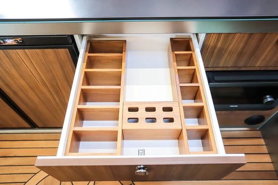 储物抽屉每层都进行了功能区划分,可以将厨具、餐具、炊具相对稳固的置于内部,行驶中减少内部晃动。