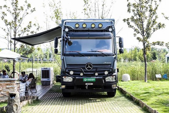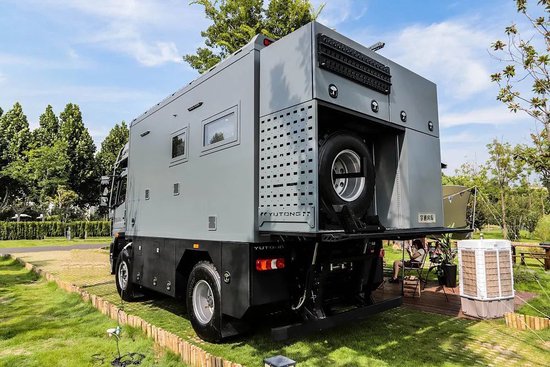 底盘部分,原厂新车就已经搭载了分时四驱系统,可靠性、耐用度要比后期改装更可靠,为了提升脱困能力,前后桥同时匹配差速锁。新车整备质量为9450kg,最大总质量10600kg,重量明显低于重卡房车,灵活度及脱困能力都会有相应提升。