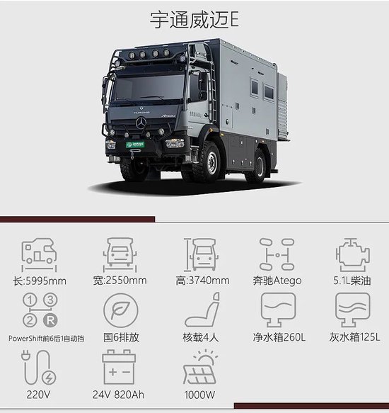 总结:接进300万元指导价的宇通威迈E,生活区选择了大量进口配件,而在细节上更是体现出高端房车的做工水准。得益于奔驰Atego 1023AWD底盘优势,发动机、变速箱及分时四驱等硬件方面表现突出,对于那些喜欢尝试冒险、追求更高品质的消费者无疑增添了新选择。以上图片及配置非最新状态,不作为购车依据,具体状态以实车为准。