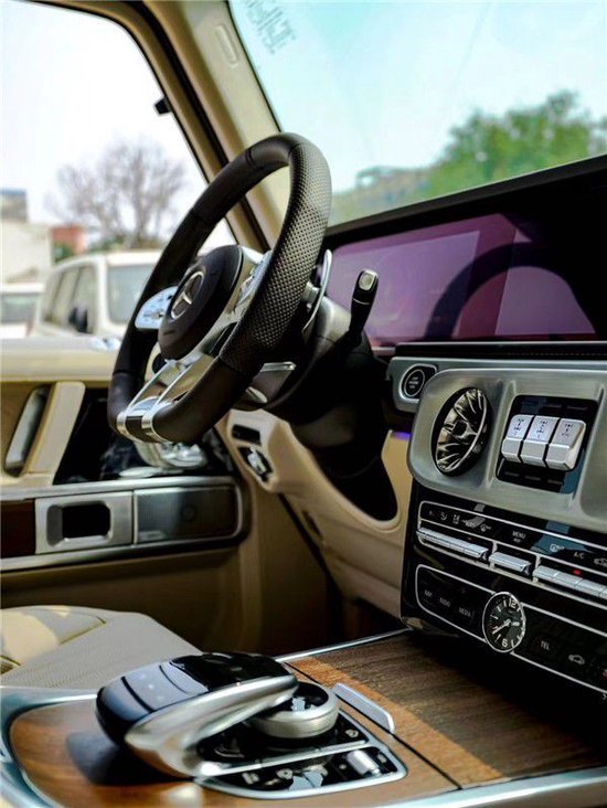 23款奔驰G63 (配置|询价)内饰上也带来了较大的变化,一改此前机械式复古的设计风格。新车采用全新家族设计语言,线条较为平直硬朗造型简洁;中控台配以大 量哑光金属材质装饰,提升内饰质感,全新设计的空调出风口造型精美。