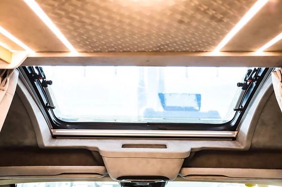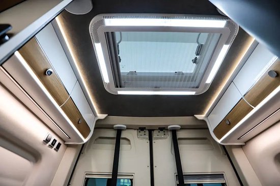 当我们将升降床完全放下,顶部装配有灯带、天窗等,除了采光作用外,天窗支持向外推开以达到通风换气的效果。