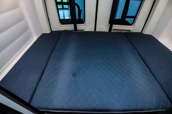 床铺完全降低,即可与左右两侧形成完整的横床,两侧盲窗设计增加了一定长度。床铺尺寸可供2名成年人休息,也能满足2+1(儿童)的旅居生活。