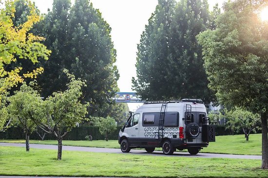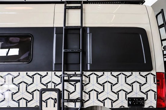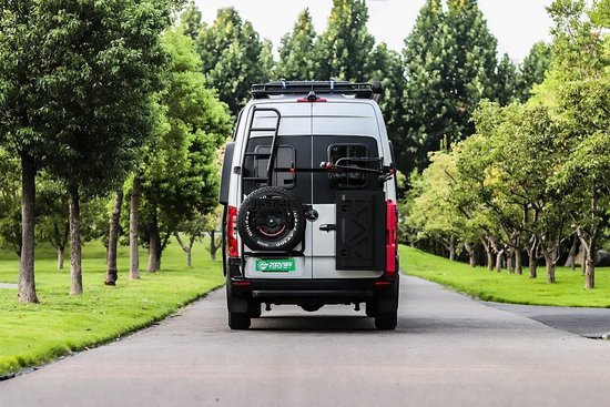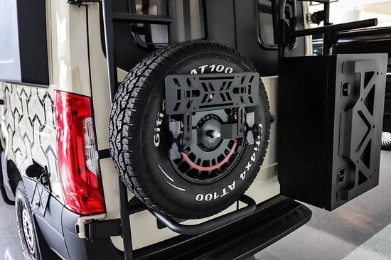 车尾配置包括爬梯、全尺寸备胎、自行车架、储物舱等。底部配有三口拖车杠。车顶位置装配了顶置行李架,用户可以从车侧、车尾爬梯够取行李物品。
