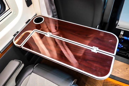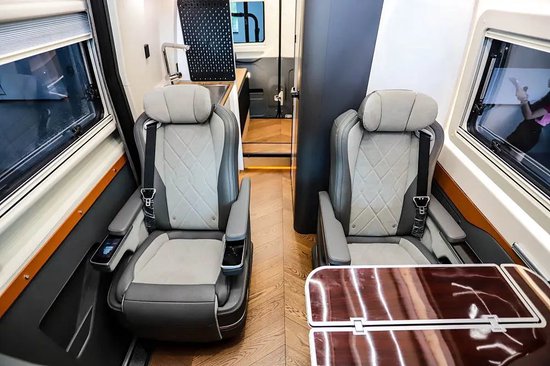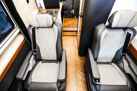 主副驾驶采用皮革/麂皮包覆,形式为一体式运动座椅,占用空间小且对于头颈部的保护更好。两张座椅支持向后旋转,可以和生活区座椅形成完整的会客区,操作方式为手动调节,并带有腿托功能。座椅中间过道位置还放置了一台25L多美达车载冰箱。