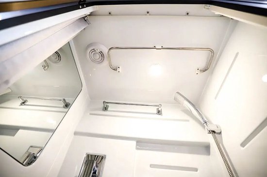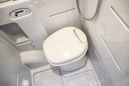 左侧商务座椅后方是独立卫浴间,内部采用一体式ABS吸塑工艺,具有更好的防水性,内部配置包括固定马桶、淋浴花洒、毛巾杆、浴室镜、卫浴帘等,翻转洗手池还可以节省更多内部空间。