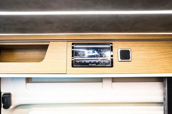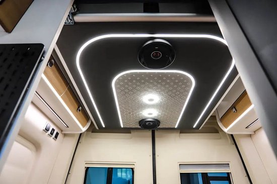 骏迈M的车内中控模块设置在车门上方,需要触控操作灯光、设备、暖风等重要设备,屏幕也能显示更多水/电信息。除此之外,新车匹配了车辆智能管控平台,手机远程就能控制/查看一些车辆功能。水电方面,骏迈M搭载160L净水箱、55L灰水箱,48V 200Ah房车专用锂电池将为车内提供电能,另外,交流充电、新能源直流快充、400W太阳能充电、48V双发电可为锂电进一步补给能源。