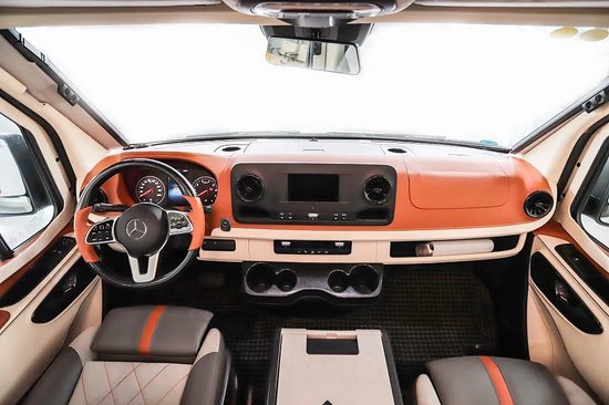 车内整体风格色调更偏向年轻群体,回字形顶灯配合内部的主光源增加了车内的明亮度,前部天窗在采光方面起到了重要作用。地板为游轮级柚木地板可以更好突出豪华质感。
