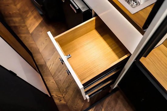 左侧座椅后方配有不锈钢洗手池,随车搭配一台便携式电磁炉室内可以制作简餐。台面下方是12V 50L电冰箱,旁边设计了三组储物抽屉。厨房台面位置配备了置物板,后期置入挂钩,餐具、厨具便可挂在上边。