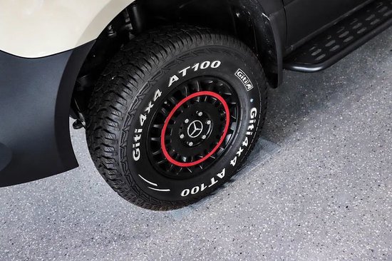 宇通针对轮胎、轮圈进行了升级,尺寸替换为16英寸锻造轮圈,匹配的轮胎规格为245/75 R16全地形越野轮胎,备胎为全尺寸规格,可以直接替换。