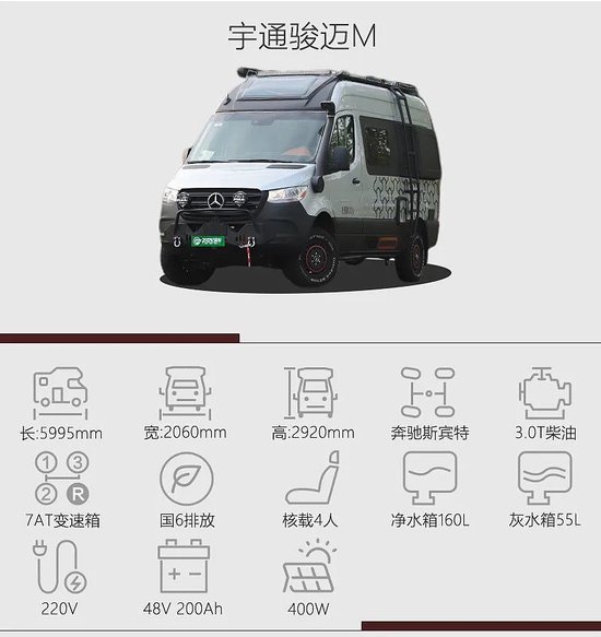 总结:骏迈M是一款适合少人数旅居体验的越野B型车,外观涉及突出硬派风格,而在硬件方面,四驱系统+中央差速锁更适合穿越环境或者简单的越野路段。生活区部分,两张商务座椅有效提升长途旅居的舒适性,完整的厨卫配置也能满足基本旅居诉求。后置横床可供2名成年人休息,很明显新车对于2人左右的旅居体验更舒适。