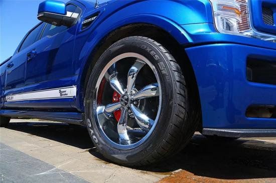 福特F150谢尔比悬挂方面使用了DBS Suspension提供的套件,以及FOX的避震。底盘除了升高强化处理,还加装了防撞护甲,保护车体免受异物撞击而受损,而且连护板上都雕出了谢尔比的字样,处处能感受到情怀的关爱。谢尔比F150使用的是18寸的双六辐轮毂,匹配的是巨大的BFGoodrich全地形轮胎,却与豪华SUV有着相同的舒适与时尚,具备了越野车更高的防震能力。
