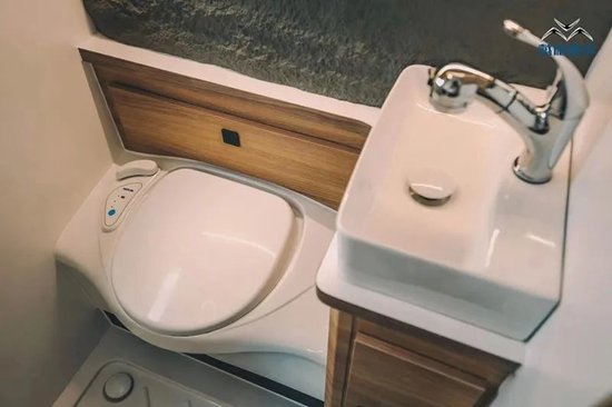 洗手间采用干湿一体的设计,内部采用智能马桶盖、集成式赛特福德抽拉盒马桶,并配备了镜子、储物柜、洗手水池等设备。洗手龙头采用抽拉设计,兼具淋浴喷头的功能。洗手台盆采用陶瓷材料,耐用性更强,不沾污垢。内部换气扇自然是标准配置,此外还配备有美的3kg全自动洗衣机,帮您免去旅途过程中手洗衣物的麻烦。水路配置为160L防浪净水箱+85L灰水箱,还带有20升电热水器,续航能力非常不错。