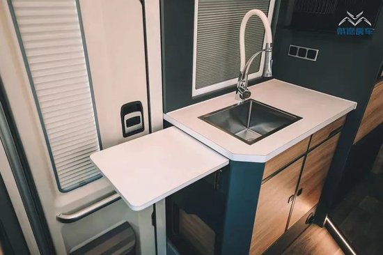 戴德URV房车厨房区域位于卡座区域对面,采用高档木材以及FORMICA台面构成。其上方配备了带大范围抽拉水龙头的大尺寸水槽,并设计有侧面翻折桌板,用于拓展工作区。匹配的电气配置达到48V5000W逆变器+48V 250AH 锂电池+ 600W 太阳能板,续航能力极佳。