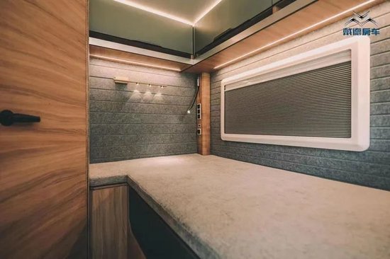 戴德URV房车尾床采用纵置式设计,带有扩展区域,扩展后的内部尺寸可达到1200*2000mm。侧边采用软包设计,灰色墙面+LED照明塑造出更加高端的感觉。