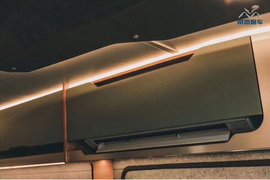 戴德URV房车采用了日本富士通的变频空调,位于卡座上方,本车制冷效果更好的同时更加省电,吹出的舒适空气正对卡座区域,营造更加宜人的内部环境。此外,车辆还配备了伟巴斯特的柴油暖风系统,冬季会更加舒适。全车采用带流水效果的LED氛围灯,进一步塑造高端感。