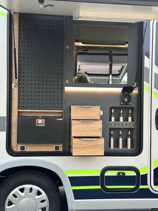 戴德URV右侧是车辆的外置厨房区域。其内部设计了调料架、45升抽屉式冰箱等配置,搭配车内原有的水槽等设备,形成了流畅的外部厨房动线,在户外烹饪时会更加得心应手。得益于这种设计,这台戴德URV房车能够成为露营生活中当之无愧的核心,和其他车辆配合,一起构成舒适的露营图景。