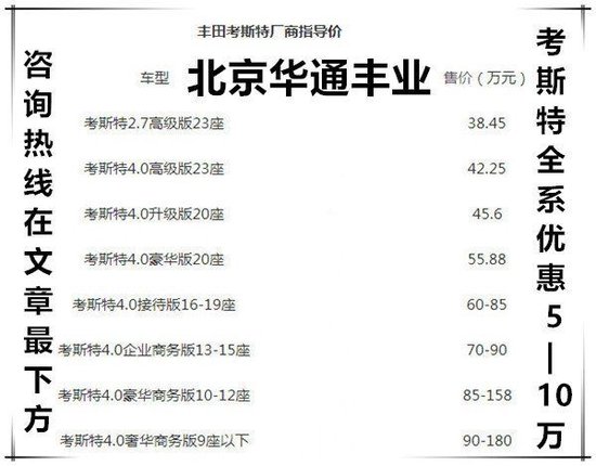 9座、10座、11座、12座、13座、15座、16座、17座、19座、20座、23座现车销售, 豪华内饰改装。考斯特整体造形美观,华通丰业内部改装布局充分考虑与丰田考斯特整车的平衡,每位乘客能切身体会尊贵。考斯特商务车的低调而不张扬,内饰设计注重简单大方,以一种端庄的态度呈现在我们的面前,而且丰田考斯特动力强劲,搭载4.0LV6的发动机 , 最大马力232,最大限速135,无论我们行驶在盘山公路还是崎岖不平的乡间小路上,华通丰业丰田考斯特满足了我们最基本的动力需求。销售热线:13011185333 魏经理 同微信