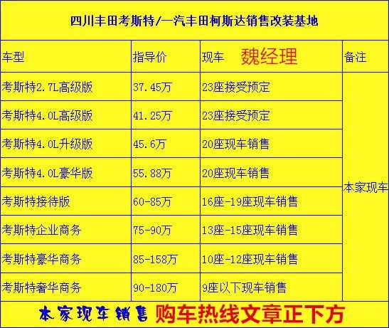 丰田考斯特 (配置|询价)房车6座7座8座配置,丰田考斯特5座6座7座8座房车系列,配有电动单人床、车载卫生间、卫星电视、卡拉ok、冰箱、微波炉、烧水器等等丰富的配置。纵观商务车的市场我们可以发现,华通丰业丰田考斯特已经发展了那么多年,同时经历了一次又一次的换代,依然能够如今在商务车市场中占有一席之地,绝对与其自身的优良品质分不开。丰田考斯特销售电话:132 6168 3333 同微信