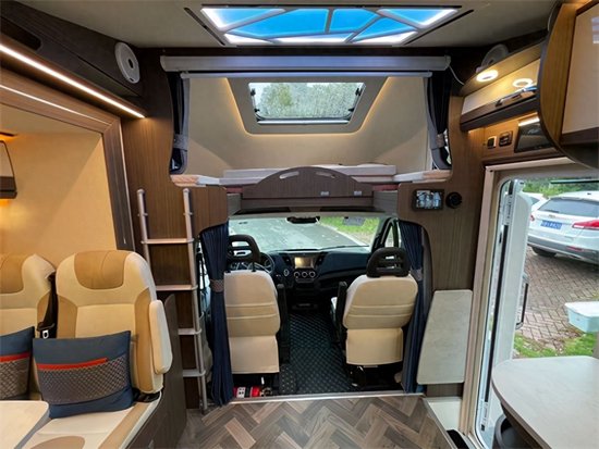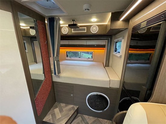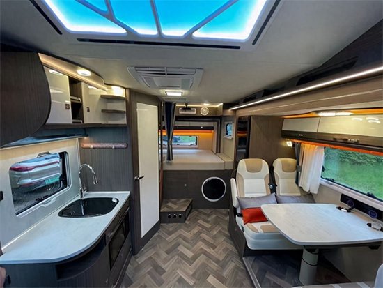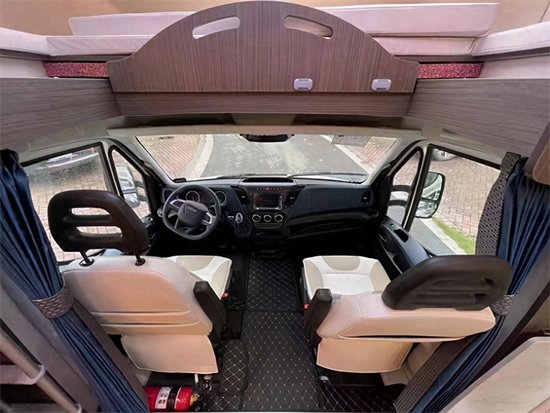全车大额头双拓展设计,侧拓仓可外出延伸73公分,为目前国内拓展中最大的拓展仓,后拓展仓延伸60公分,轻轻松松组成双人床。车内的卡座为乘务车级别的可调节座椅,进口的多级多向升降餐桌,也可轻松组成儿童床,让乘坐睡觉更舒适。顶部大额头的双人床带有天窗,看星星是个不错的景点。全车为进口E0级环保板材,进口环保房车专用地板革。