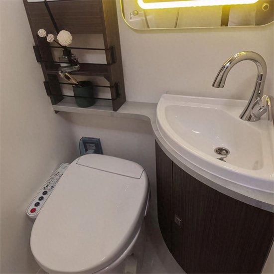 厨房是800瓦的电磁炉,同时带有车外抽拉式燃油灶,多功能的微波炉,进口带盖洗菜盆,全铝的碗碟收纳架,以及进口双开门房车专用冰箱(86.5L冷藏+55L独立冷冻),为生活饮食保驾护航。