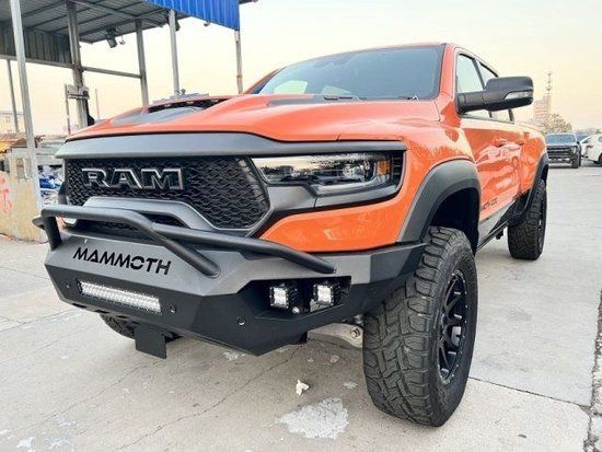 23款道奇公羊猛犸象,外观设计极具冲击感,前倾式车头,相较中规中矩的家族设计无疑多了几分对路面的侵袭感,眼神中没有透露出一丝的活泼神韵唯一展现出来的只有凶狠,贵宾购车电话:17627885113 祝经理 (微信同电话)前杠是铁质前杠带拖钩,散发这金属气息,沉稳大气,作为最畅销的车型拥有着极富侵略的前脸。
