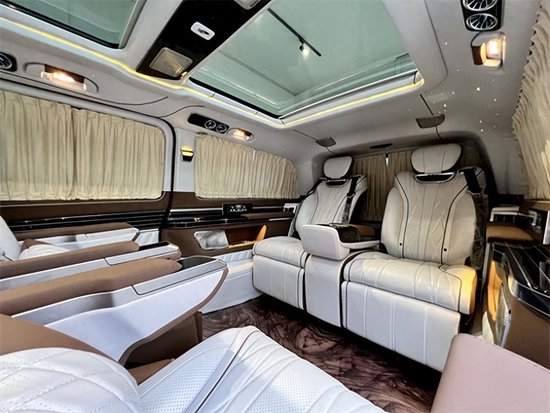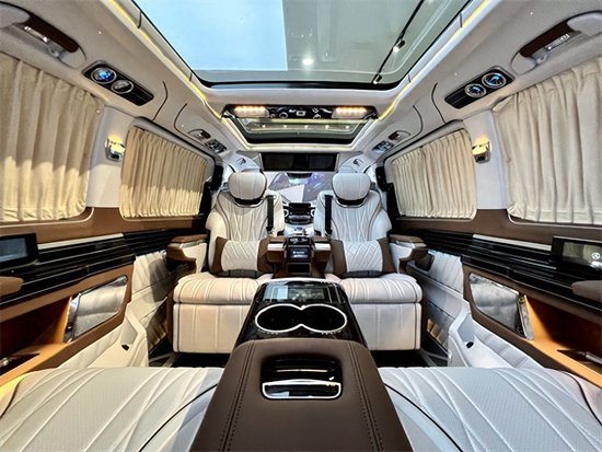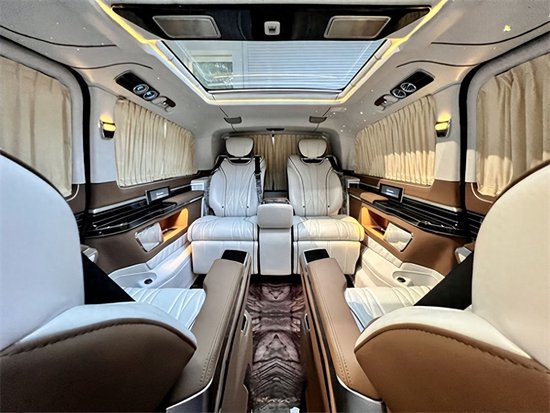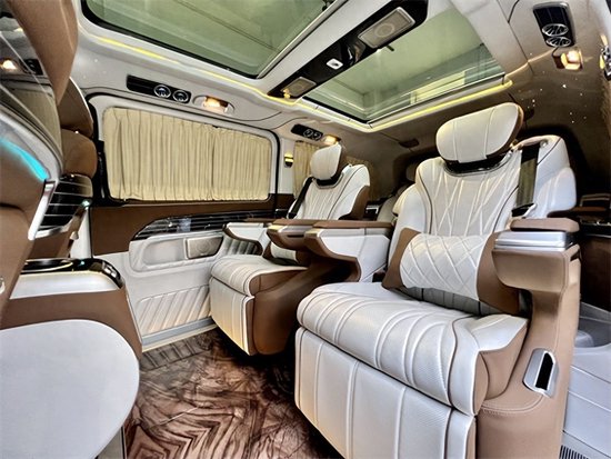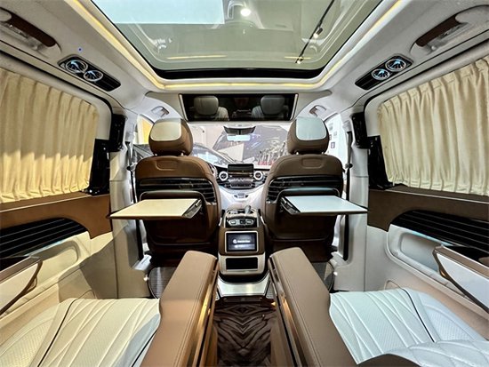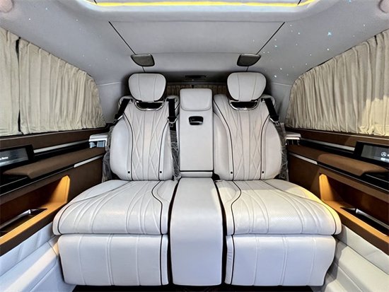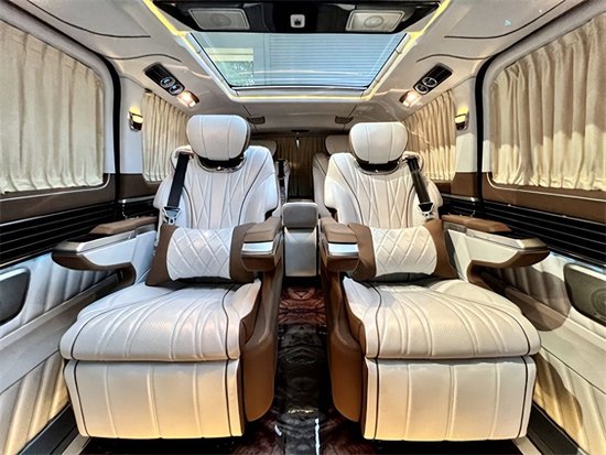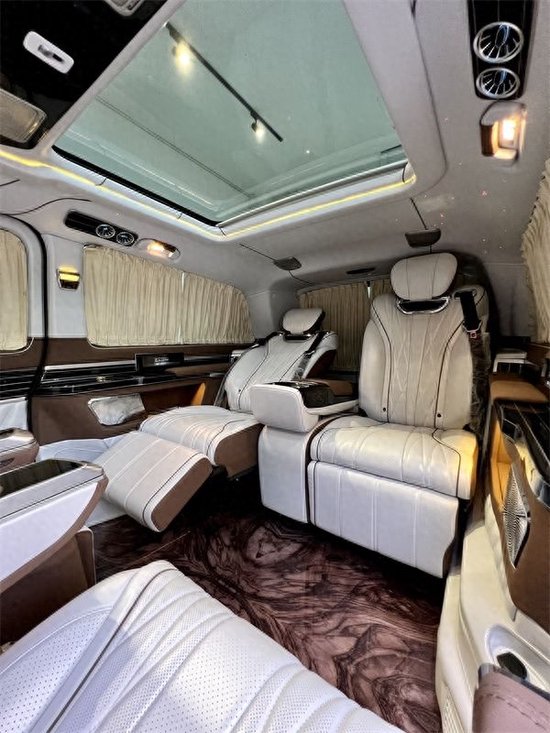 奔驰V260L平顶定制版七座商务车,后排三座采用的是电动独立分区控制沙发座椅,支持电动一键平躺,座椅变大床只需要几秒。后舱为了照顾到家庭用车居多,没有像全隔断设计那样较好的私密性,V260设计了电动遮光窗帘,让整个空间能够不被外界轻易看到。这款车就是后舱二座的座椅可以旋转,这样后·就能很便捷的形成一个·商务谈判模式。