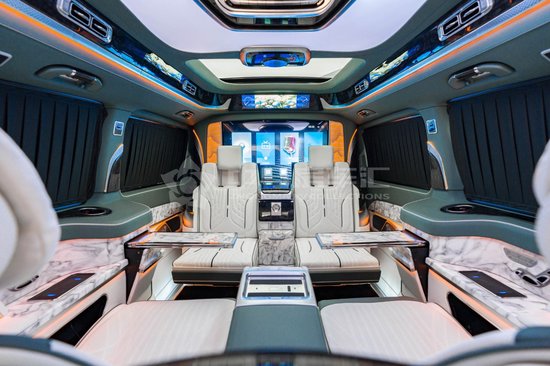 克蒂翔翼MH9奔驰商务车打开电动侧滑门,翔翼浮雕内饰设计,将隔断、立柱、内顶环舱配合外观包围的同设计语言,体现环抱之意。三色顶灯:琥珀黄、冰晶蓝、极光白三色切换。星空卷帘:368颗手工缝缀七彩光纤,繁星似锦,四种模式随意切换。并可提供12星座、12生肖个性化定制服务,与众不同。吸顶镶嵌式控制台,设计灵感源于飞机驾驶舱,体现操作的科技感,方便乘客操作,简单而高级。为了保障车内人员的隐私,不仅有隐私玻璃,更有电动窗帘环抱一周。