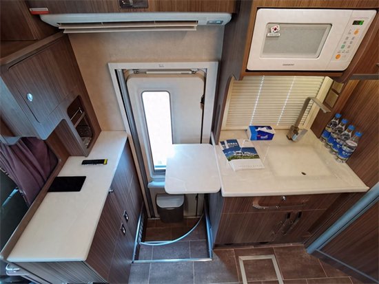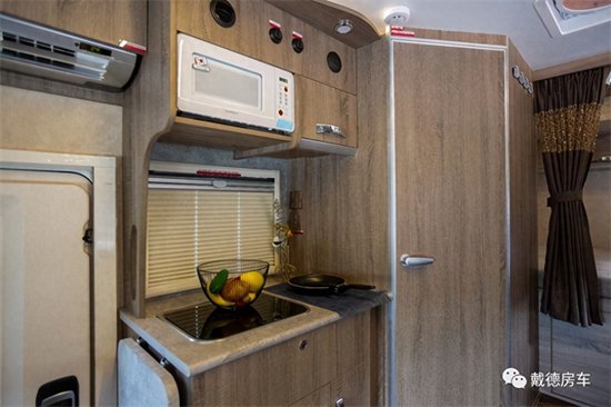 进门的左手边是我们的厨房区域,只有一个带翻盖版的洗水槽,没有配电磁炉,因为戴德的设计师认为,所有的电器更新换代比较快,在面板上挖个洞储放电磁炉,万一哪天电磁炉坏了,一方面是找不到同型号的进行匹配,另一方面,破坏了灶台的结构。所以,戴德房车配的是移动的小米电磁炉,非常的方便,可以车内车外使用。