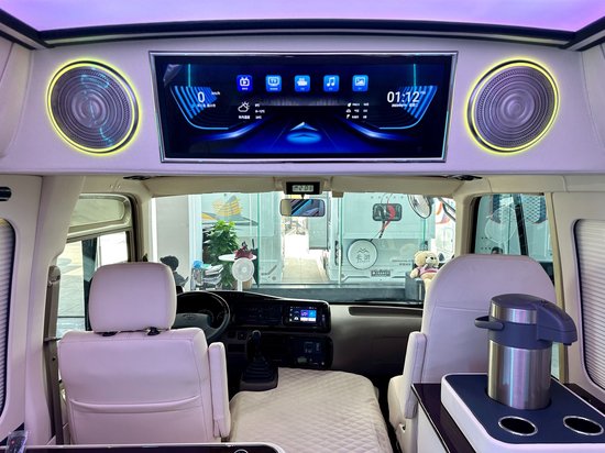 生活配置上,进门处有冰箱,在炎热的夏季,车内能够提供冰水,还是非常惬意的一件事情。上方也单独配备了热水壶,体寒的人喝点热水,泡泡茶也能够满足,可以说是用途功能多多。顶部是无线网络电视机,可以连接车载WiFi或者手机无线热点,看看电视,听听音乐,也能够缓解旅途的疲劳,增加更多的乐趣。